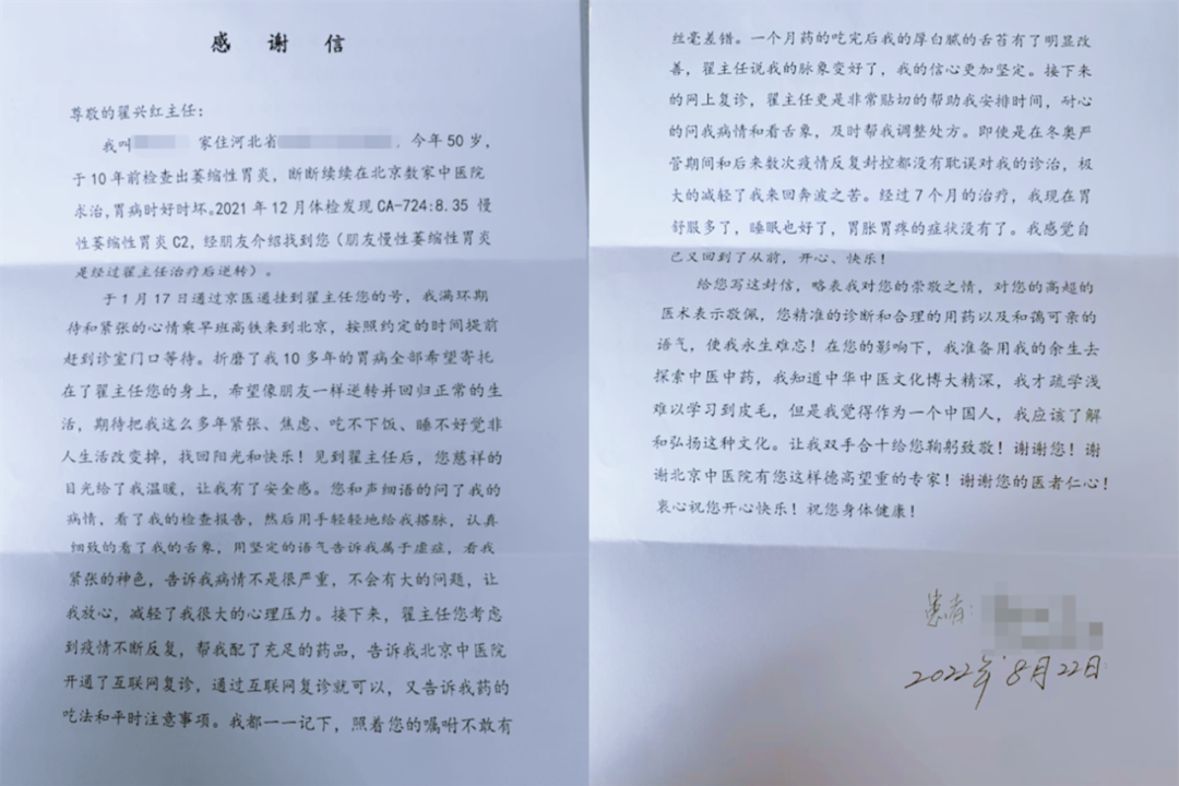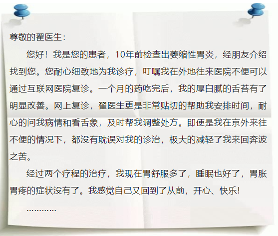 文章开头的感谢信来自患者韩先生(化名),作为长期受到胃病折磨的“老病号”,十年来反反复复的疾病令他痛苦不已。翟兴红医生为韩先生对症开药,同时还考虑到他跨省就医的困难,在我院互联网医院视频诊疗,线上问诊、送药到家,方便他有医可看,确保有药可用。在经过两个疗程的治疗,韩先生“胃舒服多了,睡眠也好了,胃胀胃疼的症状没有了,感觉自己又回到了从前,开心,快乐!”