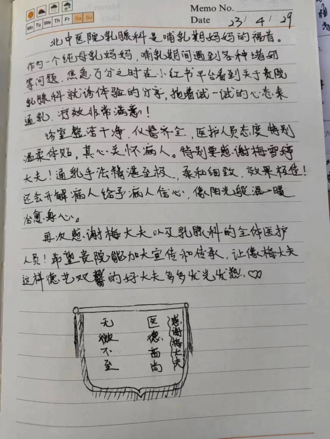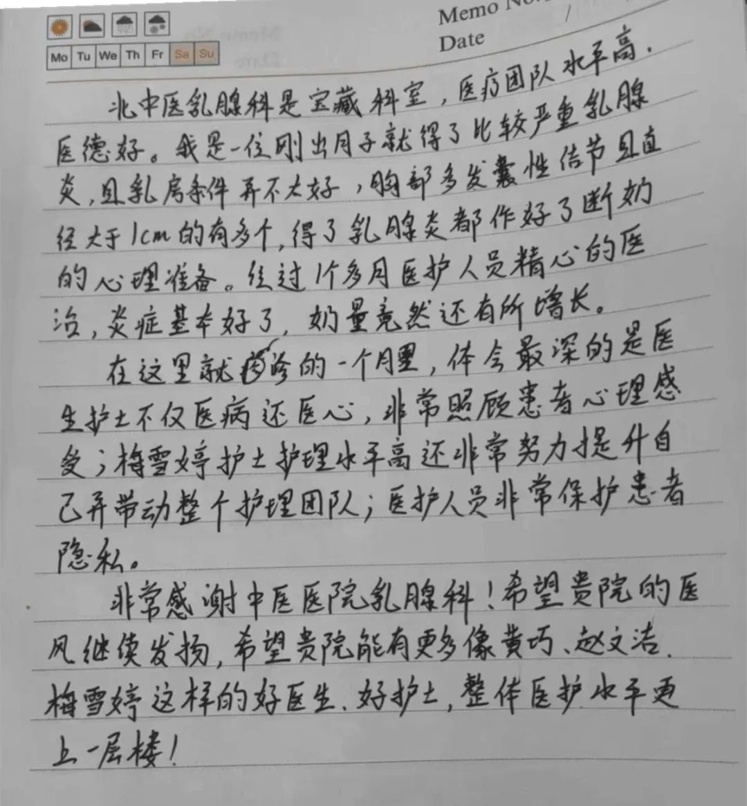 “北京中医医院乳腺科是宝藏科室,医疗团队水平高、医德好……”小陆是一位刚出月子就患上了严重乳腺炎的新手妈妈,胸部有多个直径大于1cm的囊性结节,得了乳腺炎的她都作好了断奶的心理准备。经过乳腺科医护人员精心医治,不仅炎症得到了缓解,奶量也有所增长。惊喜万分的她在留言簿上写下了自己的心声。