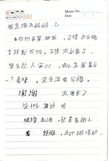 “你们真算救我,可惜这么晚才找到你们,这儿是我最后的希望,完全没有后悔。谢谢!”有些“拗口”的中文,略显“稚嫩”的手写字迹,来自埃及妈妈阿娅写给北京中医医院乳腺科的感谢信。
