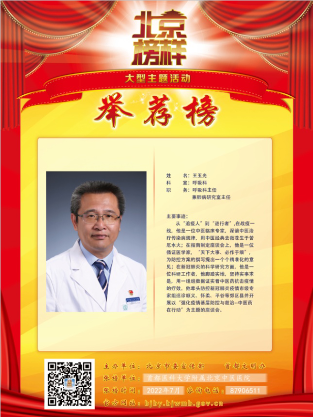 2019年的春节前夕,武汉疫情爆发难控,作为国家中医药管理局指定专家,北京中医医院呼吸科主任王玉光临危受命,在除夕前夜紧急踏上了奔赴武汉的行程!作为曾经的抗击SARS战士,再次第一时间加入到抗击“新冠”的战斗中,抵达武汉后便迅速深入金银潭、武汉中西医结合医院、武汉市中医院,指导新冠救治,与国家中医药管理局专家一起20余日的通宵达旦,率先制定出中医诊疗方案,推广全国。