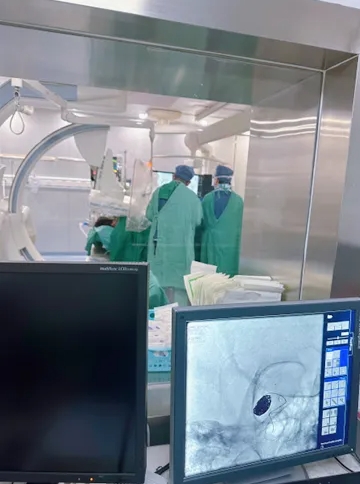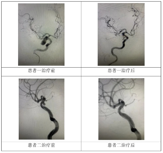 在医务处、麻醉科、放射科、心血管科、内分泌科、重症医学科等科室的协作与支持下,两例患者在导管室全麻下行经皮穿刺颅内动脉瘤支架辅助弹簧圈栓塞术,手术从上午9点至下午4点钟结束,两名患者动脉瘤均顺利完成栓塞,手术结果评估良好。