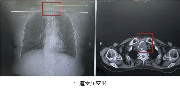意识到问题严重性的她来到北京中医医院普外/肿瘤外科甲状腺专病门诊就诊。经过检查发现,齐阿姨的甲状腺肿物已经长到接近15厘米大小,坠入到胸骨后,气管已经被巨大的甲状腺肿物压迫的歪向左侧,最狭窄处仅剩3.9毫米。如果肿物继续增长,齐阿姨就面临着无法呼吸的风险,手术治疗迫在眉睫。