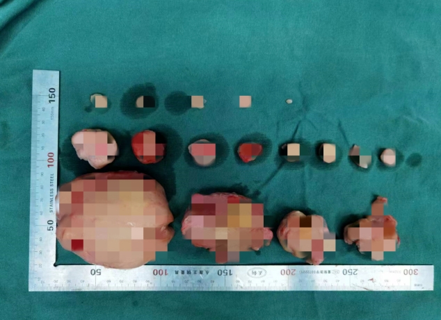 1颗、2颗、3颗……鸡蛋大小、花生米大小、黄豆大小……两位医生谨慎、小心又耐心地处理这些大大小小的肌瘤。经过3小时的手术探寻肌瘤、逐个剥除,主刀医生共摘除整整17颗肌瘤,最大的达到9cm!