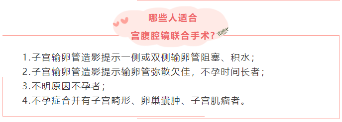 宫腹腔镜联合手术治疗不孕症,指在手术过程中同时使用宫腔镜、腹腔镜两套设备,一次性检查子宫、卵巢、输卵管等情况,可即时进行全面分析及诊断,以科学的角度,准确而快速地进行针对性治疗。如松解盆腔粘连,包括输卵管、卵巢、子宫之间的粘连;对于输卵管异常情况得以改善,在明确诊断治疗后可更易受孕或借助辅助生殖治疗受孕,兼有诊断和治疗作用。同时因其具有不开腹、出血少、术后恢复快等优点,目前已成为女性不孕症检查和治疗的常用方法。
