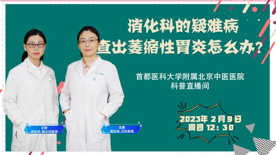 2月9日,北京中医医院消化科主任医师沈晨、副主任医师王帅做客科普直播间,讲解“查出萎缩性胃炎怎么办”,从萎缩性胃炎到胃癌的发展进程、慢性胃炎的病因及病程、幽门螺杆菌感染的治疗原则、胃镜检查的种类和选择、中医中药治疗胃炎的优势和特色等方面进行了全面科普,并回答了广大网友关于萎缩性胃炎的相关问题。