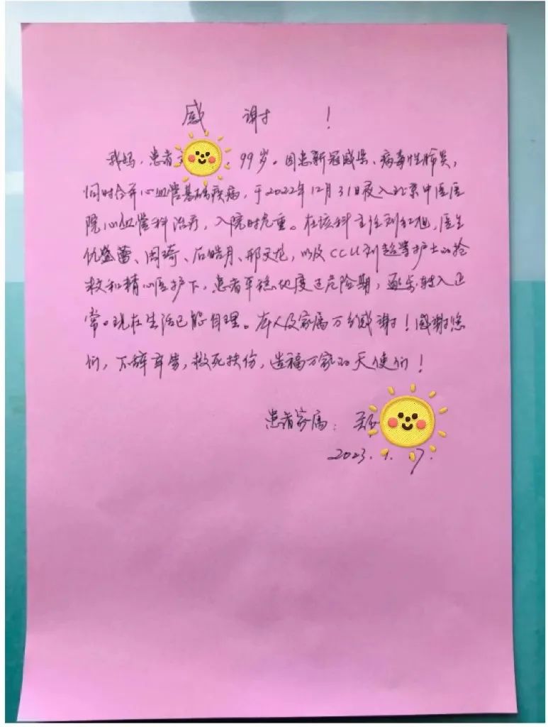 “感谢您们,不辞辛苦,救死扶伤,造福万家……”李奶奶出院后,家属为心血管科医护人员送来了感谢信,说老人已经能生活自理,比以前状态还好!