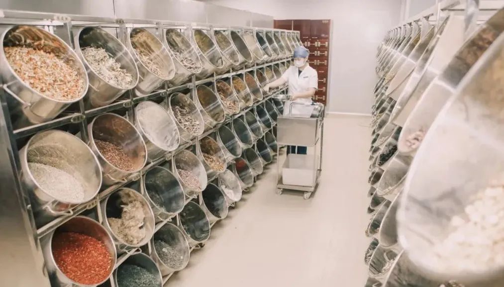 与印象中的“齐眉对戥”不同,在门诊代煎室,调剂人员推着带有电子秤的调剂车称取饮片。精心规划的斗位既能够帮助调剂人员尽快找到对应饮片,又能满足一次称取较大剂量的需求,方便又高效。