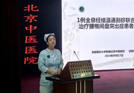 北京中医医院疮疡血管外科护士长岳丽娜作了《1例全息经络温通刮痧联合偏振光照射治疗腰椎间盘突出症患者的护理报告》分享,依据中医护理的辨证施术实行全息经络刮痧,以现代医学护理改善症状为目的,进行偏振光照射治疗。