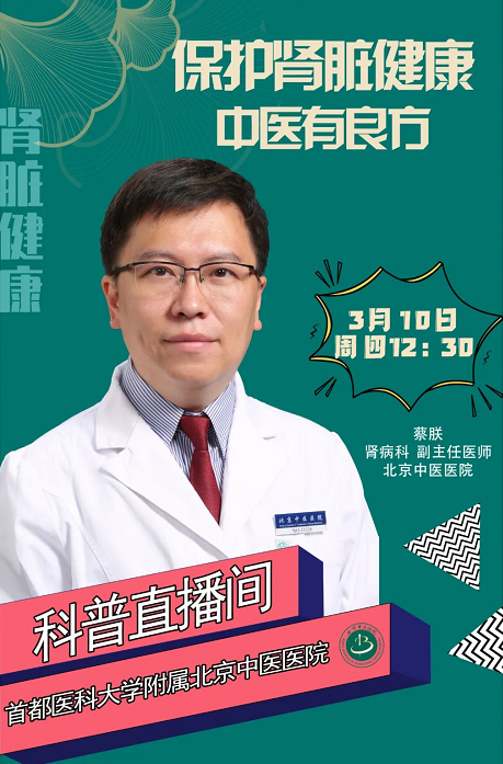3月10日中午12:30,肾病科蔡朕副主任医师做客科普直播间,为您详解肾脏健康。