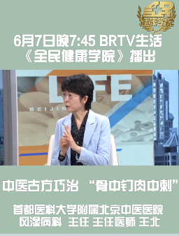 今日19:45,北京中医医院风湿病科王北主任医师做客北京广播电视台生活频道《全民健康学院》,讲述中医古方如何巧治“骨中钉肉中刺”,敬请关注。
