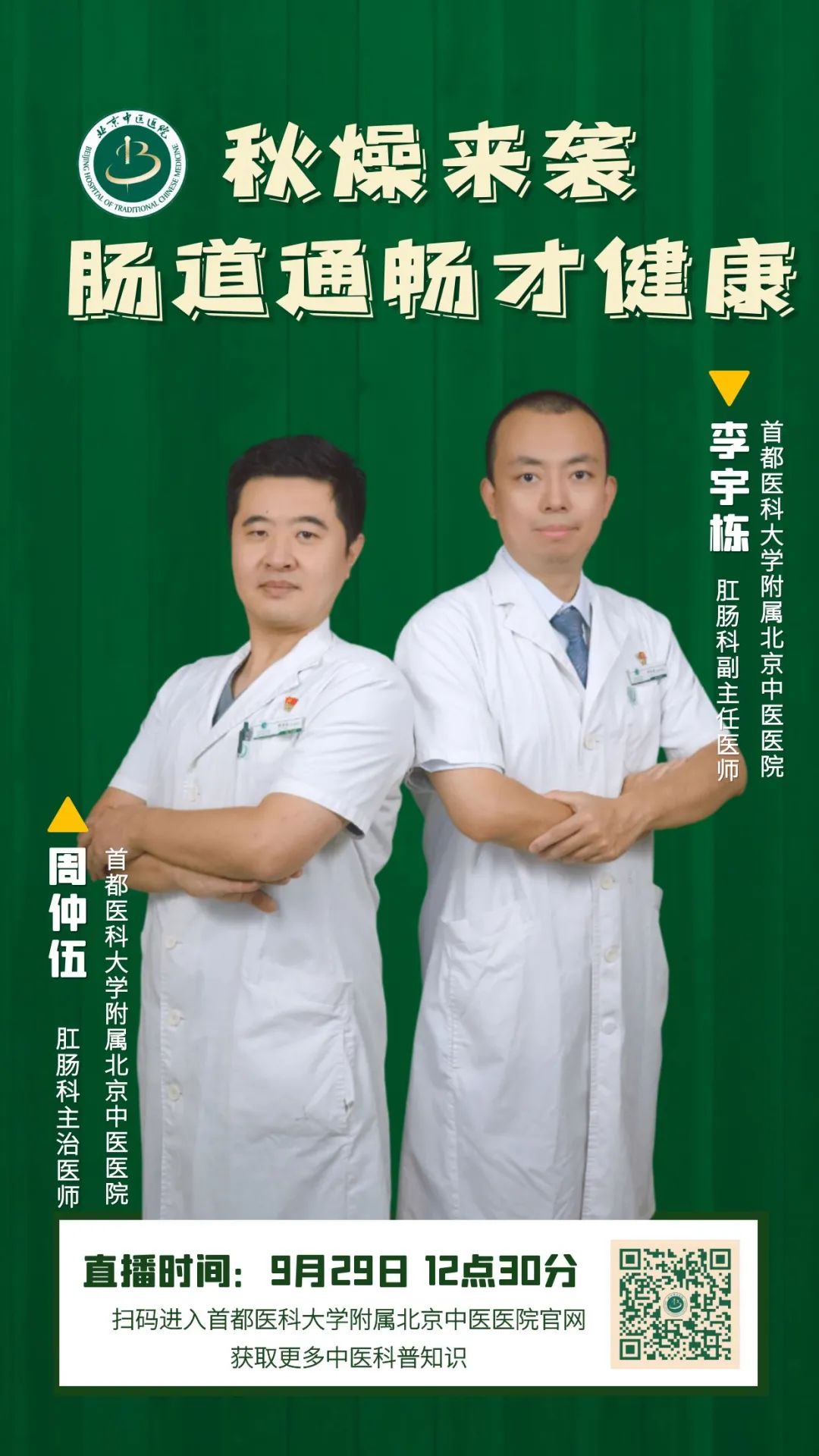 9月29日12:30,肛肠科李宇栋副主任医师、周仲伍主治医师做客北京中医医院科普直播间,带您一起找回秋日健康。
