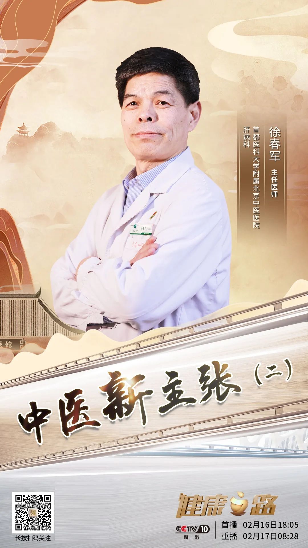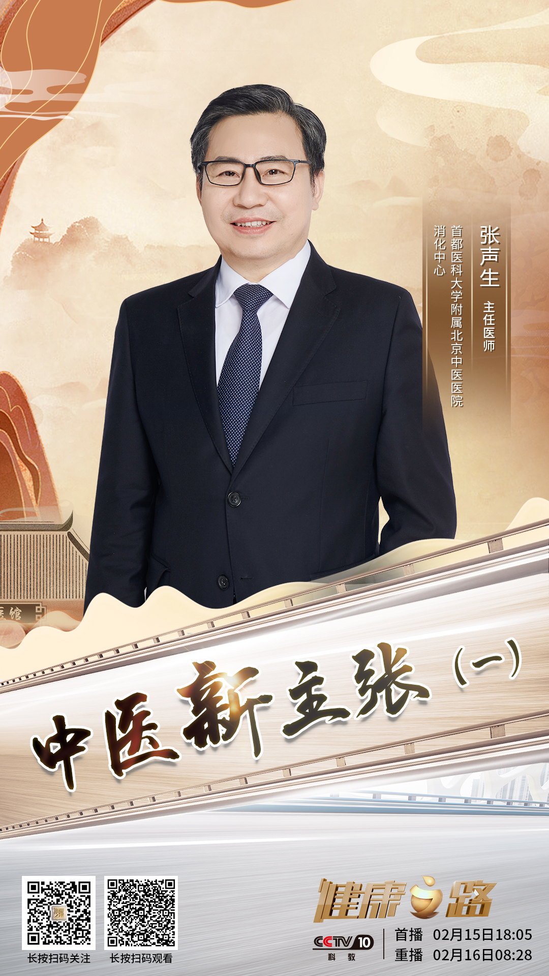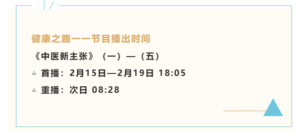 中华医学历经千年传承,无数中医为其守护与创新。新思维、新探索,让中医经典焕发新的光彩。2月15日-2月19日,我院多位专家做客CCTV10《健康之路》“中医新主张”系列节目,带您领略现代中医的创新与发展,敬请关注。