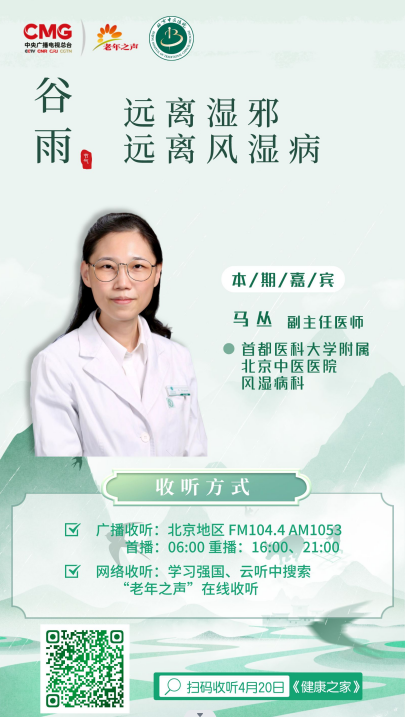 谷雨是二十四节气的第六个节气,也是春季最后一个节气,谷雨节气后降雨增多,雨生百谷,雨量充足而及时谷类作物茁壮成长。北京中医医院风湿病科副主任医师马丛为您讲解,如何远离湿邪,远离风湿病。