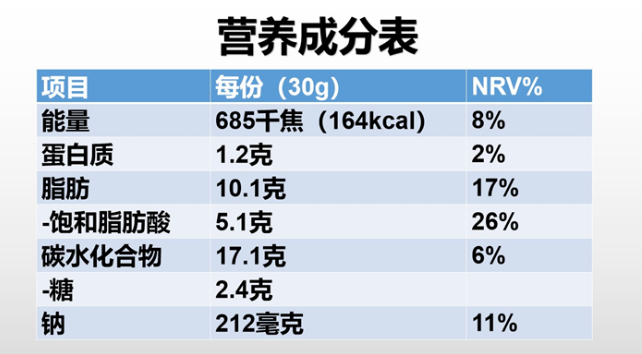 挑选零食其实有一个小窍门,那就是学会看食品标签。标签通常有三列,第一列是列出来食品能量和所含营养素的项目,第二列为给出的一份或者100g食品的热量以及所含蛋白质、脂肪、碳水化合物、钠等。第三列是NRV%,中文全称是“营养素参考值百分比”,表示该食品中的某种营养素含量占该营养素人体全天所需量的百分比。