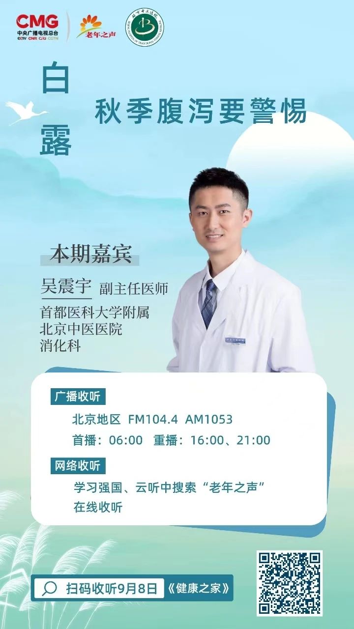 俗话说:“白露身不露,着凉易泻肚”,说明白露节气易“着凉”而发生腹泻,如何防范秋季腹泻?首都医科大学附属北京中医医院消化科副主任医师吴震宇做客中央广播电视总台老年之声《健康之家》,为您详解《秋季腹泻要警惕》。