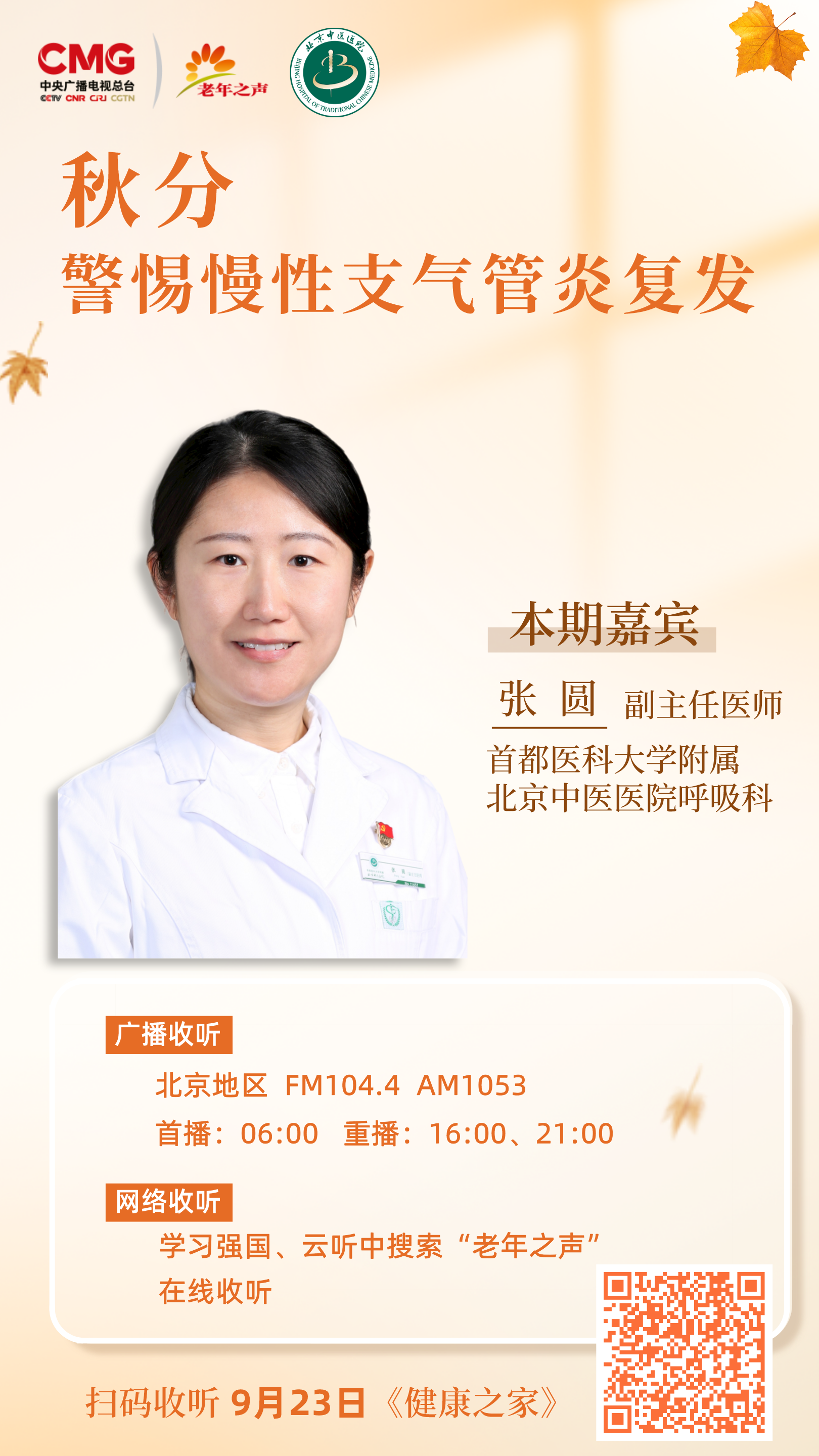 首都医科大学附属北京中医医院呼吸科副主任医师张圆做客中央广播电视总台老年之声,为您详解《秋分节气,警惕慢性支气管炎复发》。