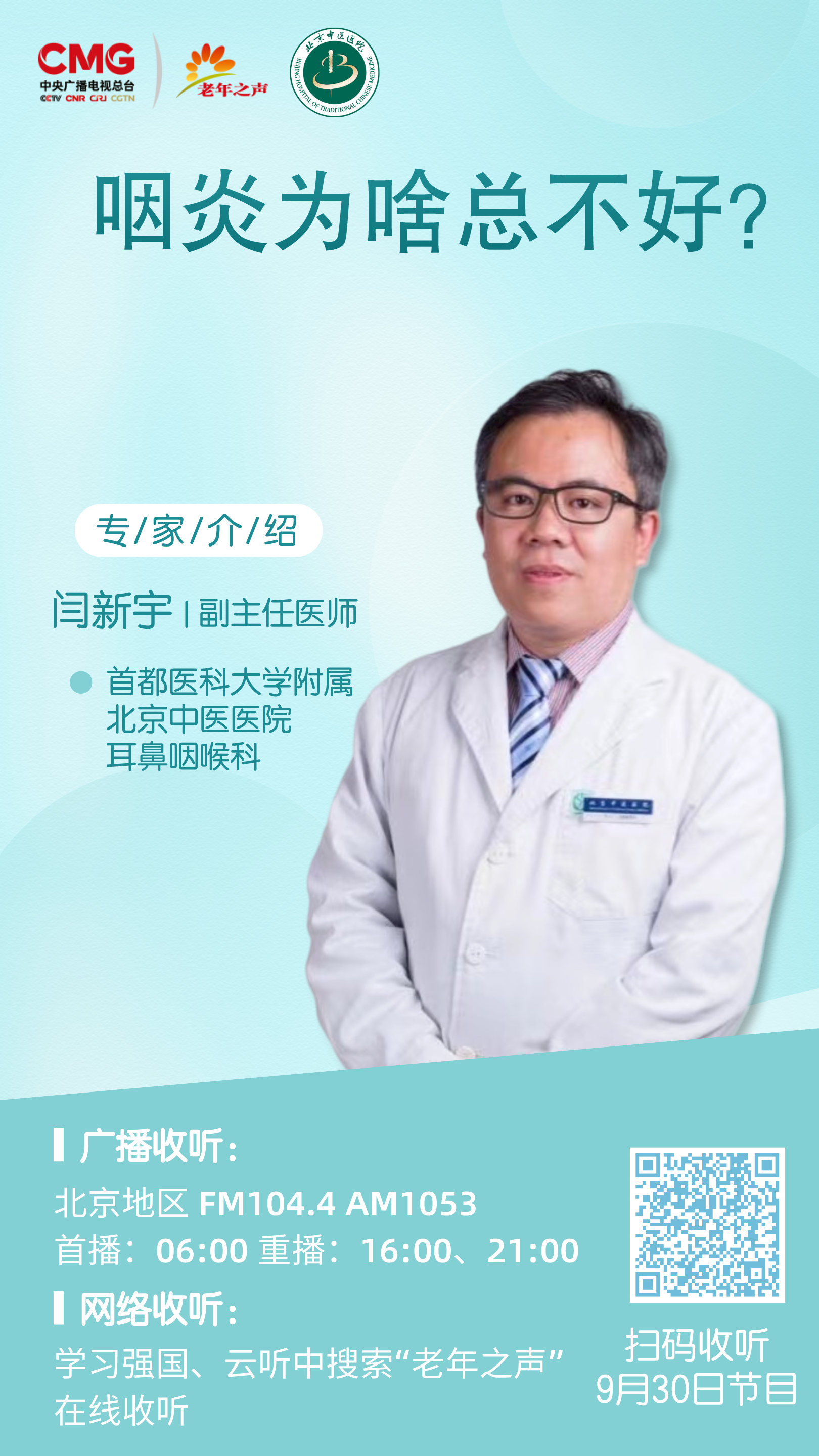 首都医科大学附属北京中医医院耳鼻咽喉科副主任医师闫新宇做客中央广播电视总台老年之声,为您详解《咽炎为啥总不好》。