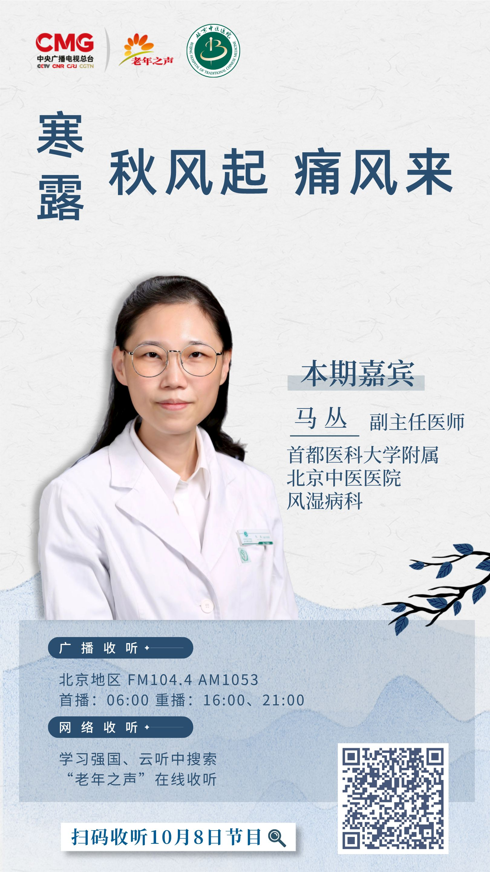 10月8日是寒露,也是秋季的第五个节气,昼夜温差越来越多,不少人进食高脂肪、高热量、高嘌呤的食物要比以往更频繁。首都医科大学附属北京中医医院风湿病科副主任医师马丛做客中央广播电视总台老年之声,提醒您,寒露节气防痛风。