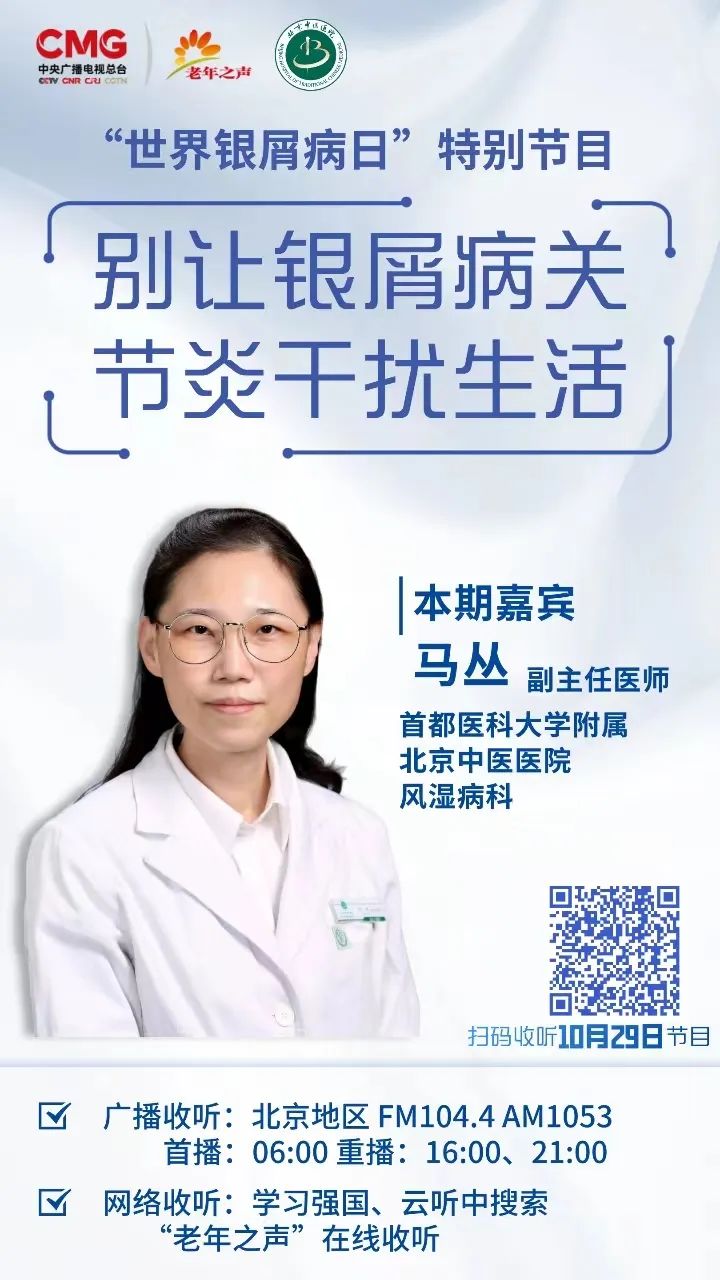 首都医科大学附属北京中医医院风湿病科副主任医师马丛做客中央广播电视总台老年之声,为您详解《别让银屑病关节炎干扰生活》。