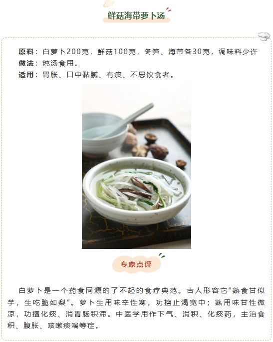 常言道,“冬吃萝卜夏吃姜,不让医生开处方”。萝卜又名莱菔,为十字花科植物莱菔的新鲜根。味甘、辛,性平。色白,属金,入肺,归肺脾经。《本草纲目》记载:“根、叶可生可熟,可糖、可醋,可饭,乃蔬中之最有利益者。宽中化积滞,下气化痰浊。”