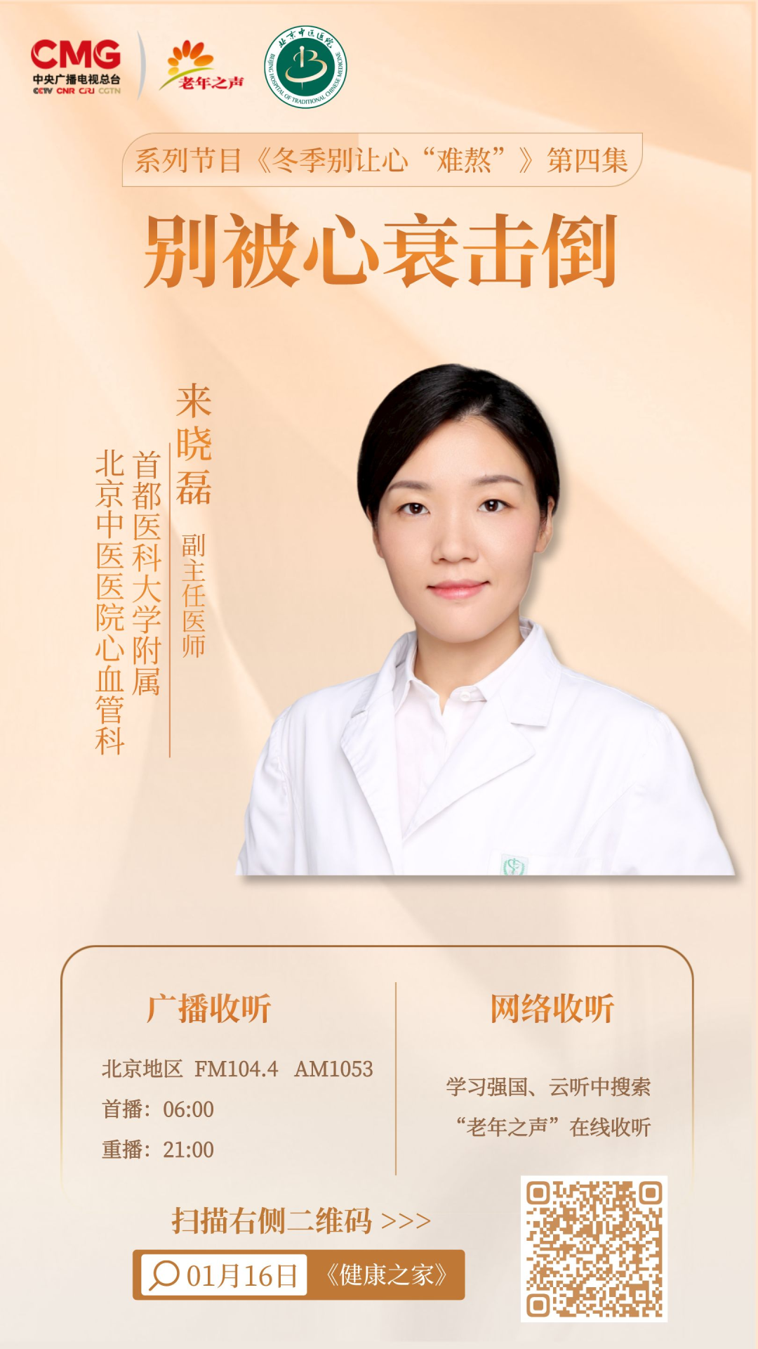 1月16日,首都医科大学附属北京中医医院心血管科副主任医师来晓磊做客中央广播电视总台老年之声《冬季别让心“难熬”》系列节目,为您详解《别被心衰击倒》。