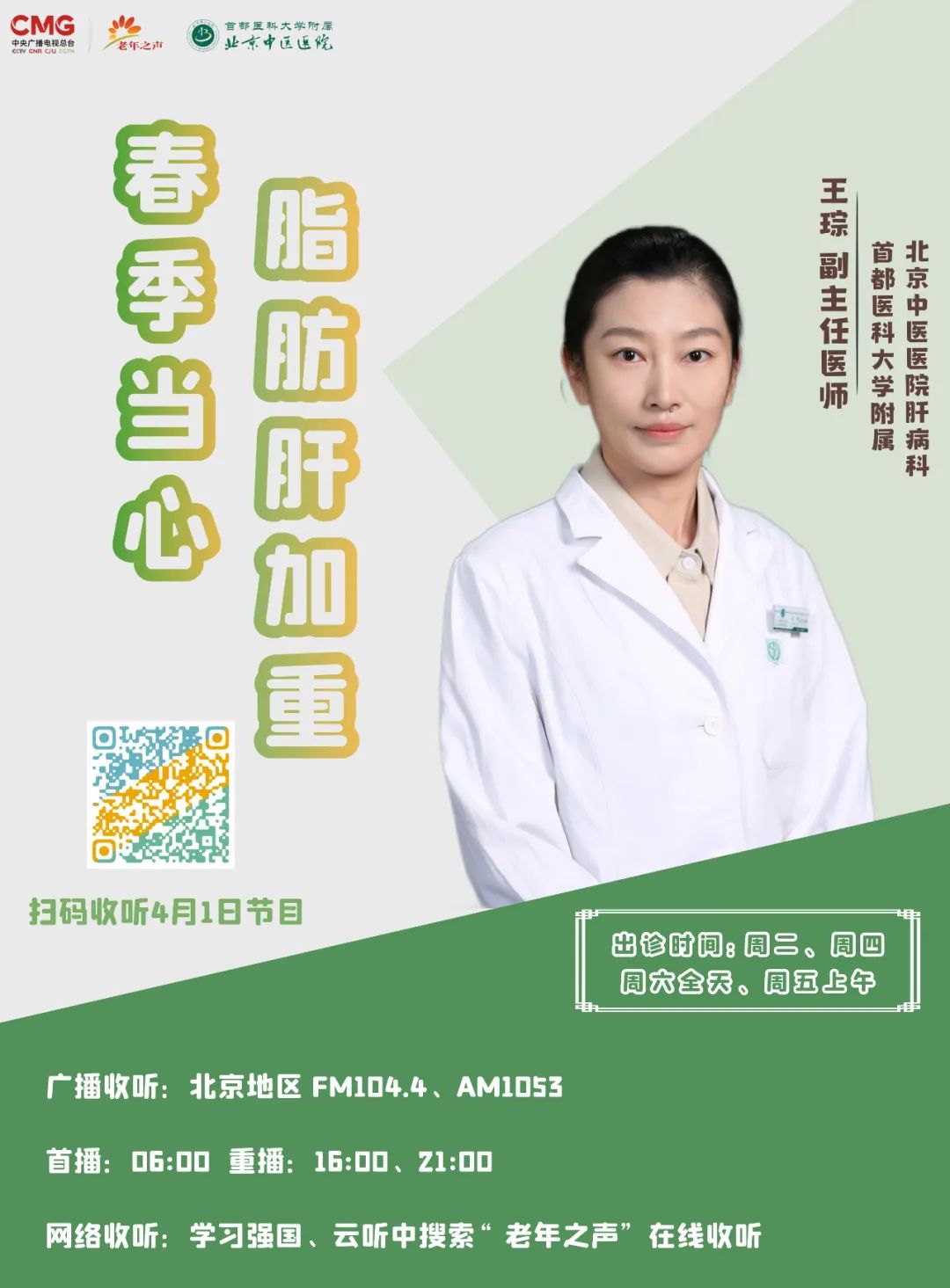 首都医科大学附属北京中医医院肝病科副主任医师王琮做客中央广播电视总台老年之声,为您详解“春季当心脂肪肝加重”。