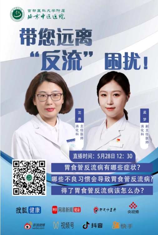 消化科主任医师沈晨、副主任医师孟梦做客北京中医医院科普直播间,带您远离“反流”困扰。
