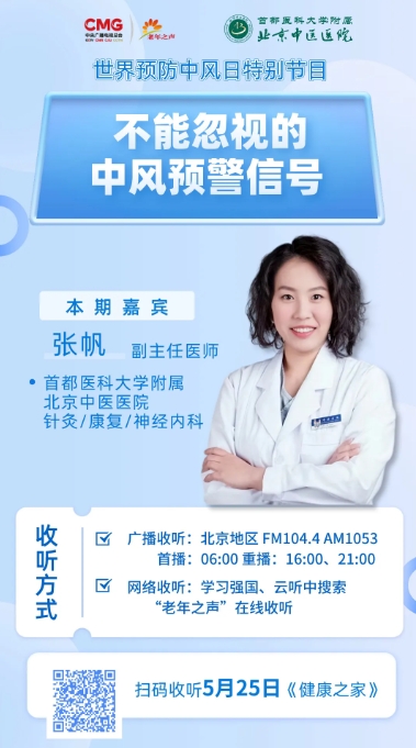 每年5月25日是世界预防中风日。首都医科大学附属北京中医医院针灸/康复/神经内科副主任医师张帆做客中央广播电视总台老年之声,为您详解不能忽视的中风预警信号。