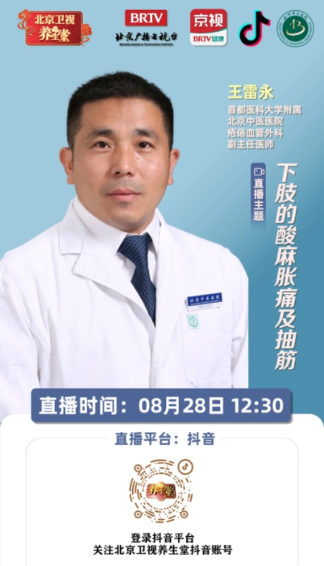 8月28日12:30,北京中医医院疮疡血管外科副主任医师王雷永做客北京卫视养生堂科普直播间,详解《下肢的酸麻胀痛及抽筋》。