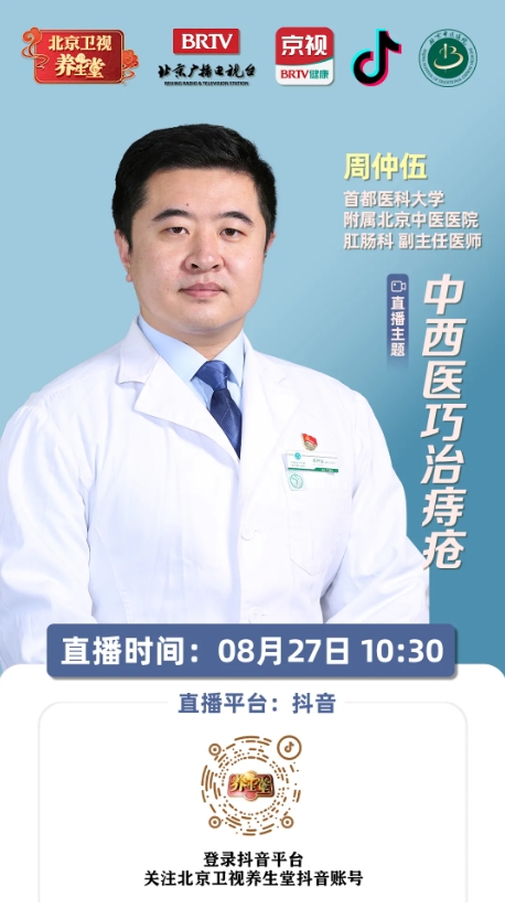 8月27日10:30,北京中医医院肛肠科副主任医师周仲伍做客北京卫视养生堂科普直播间,详解《中西医巧治痔疮》。