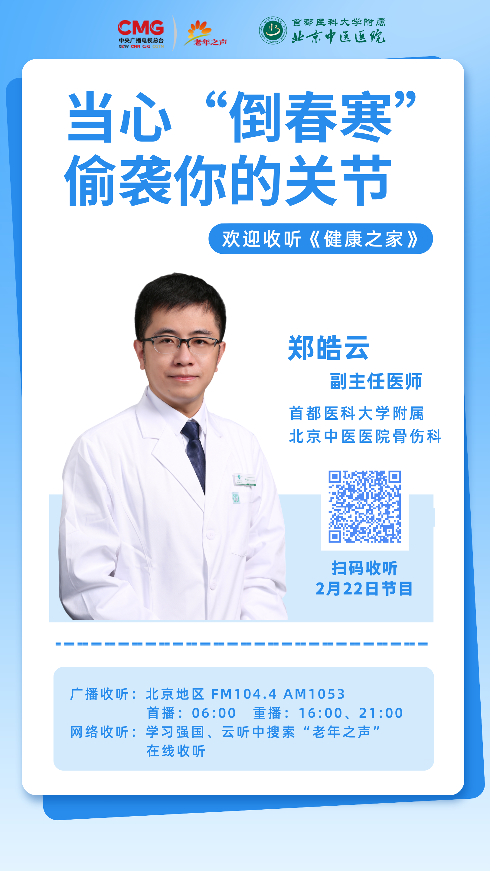 首都医科大学附属北京中医医院骨伤科副主任医师郑皓云做客中央广播电视总台老年之声,讲解“当心‘倒春寒’偷袭你的关节。”