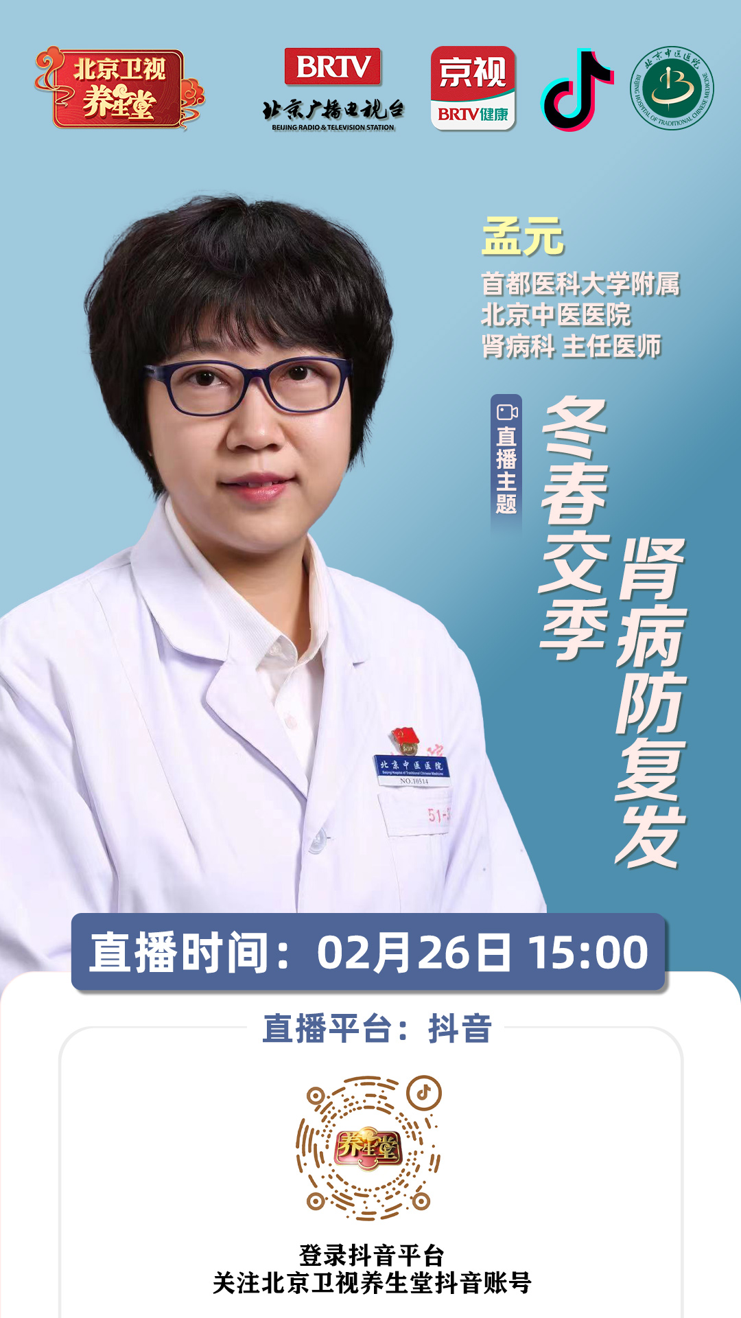 宽街·明医说 | 2月26日15:00 我院肾病科专家做客北京卫视养生堂直播间,讲解“冬春交替 肾病防复发”