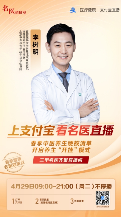 4月29日19:30,首都医科大学附属北京中医医院疼痛科主任医师李树明做客支付宝名医值班室科普直播间,分享春季中医养生硬核清单,开启养生“开挂”模式。扫描下方海报中的二维码预约观看直播吧。