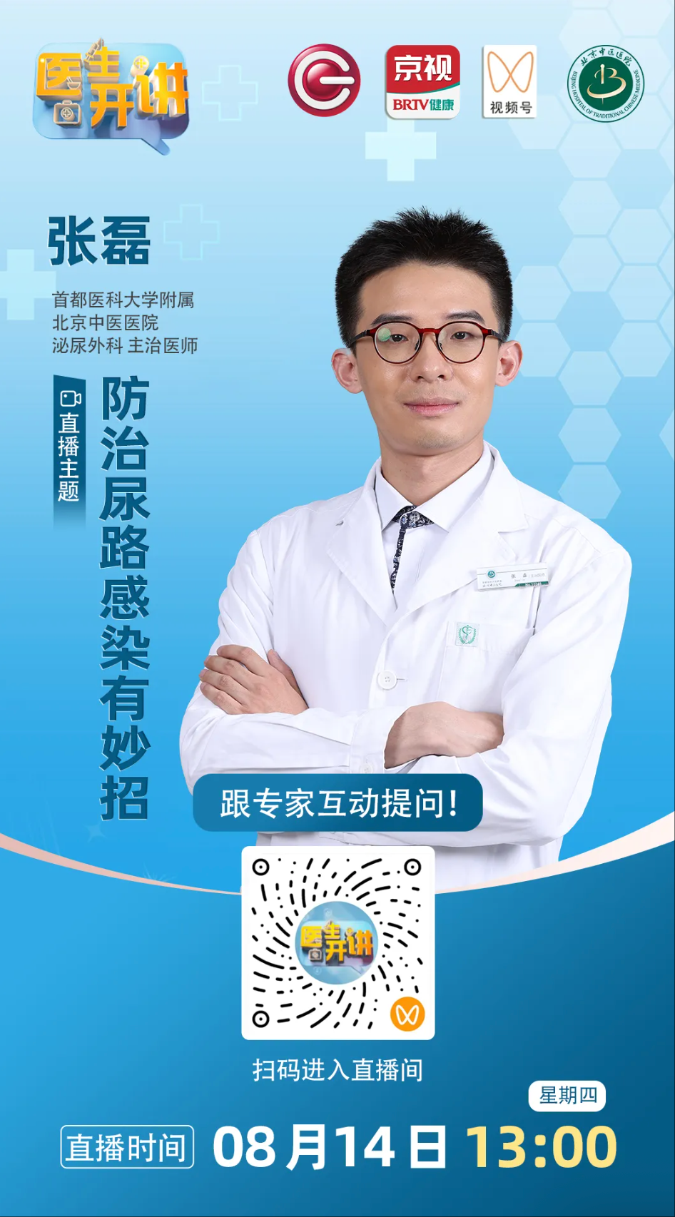 8月14日13:00,首都医科大学附属北京中医医院泌尿外科主治医师张磊做客《医生开讲》科普直播间,讲解“防治尿路感染有妙招”。