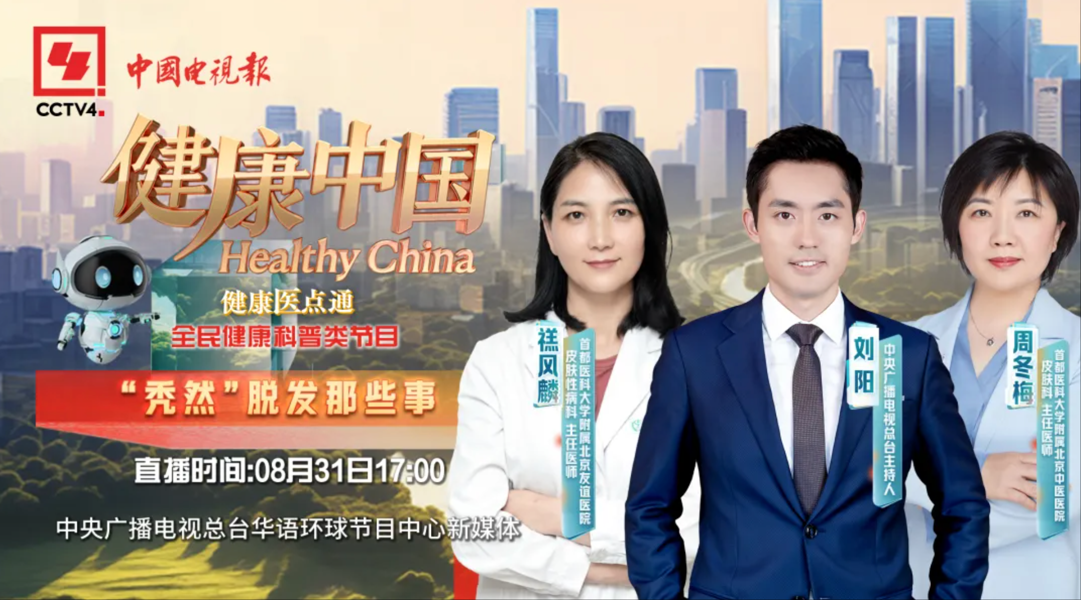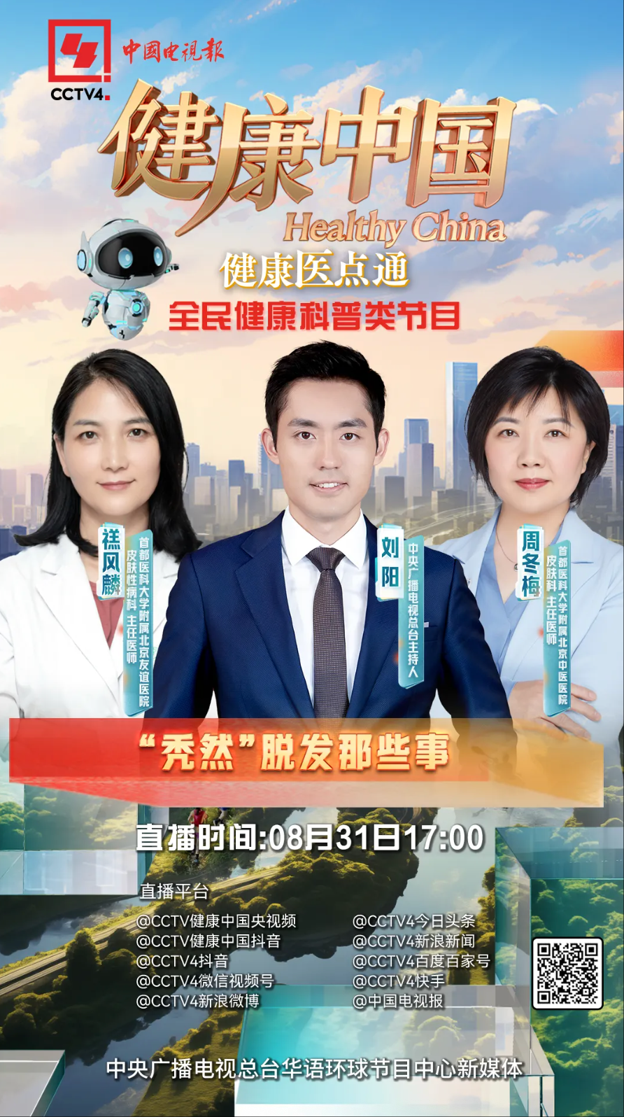 《健康中国》采用“电视+新媒体”融合直播方式,今天17:00,栏目将在CCTV4新媒体矩阵,CCTV健康中国抖音号开启直播,150分钟健康直播等你来。