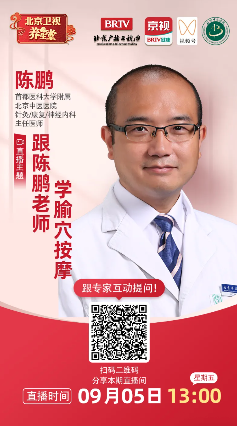 9月5日13:00,首都医科大学附属北京中医医院针灸/康复/神经内科主任医师陈鹏做客北京卫视养生堂科普直播间,讲解腧穴按摩。