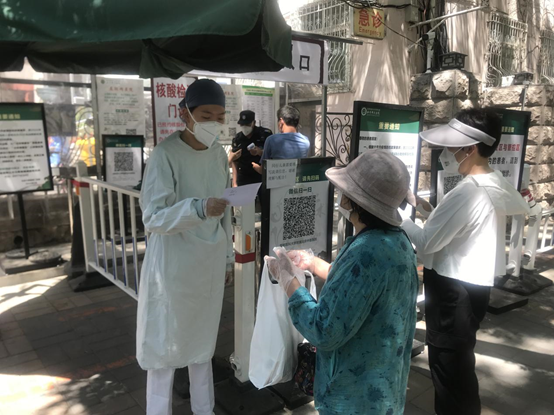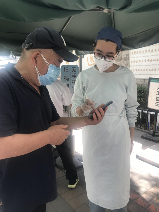 5月的一天,位于东门的一级预检分诊处来了一位既未做核酸,也没有手机、没有亲属陪同的老人,工作人员详细询问了老人的流行病学史,人工登记后陪同老人完成医保卡激活、预约号源、核酸采样流程。因老人有些听力下降,工作人员将注意事项、就诊流程等书写在老人自带的笔记本上,反复嘱托后才放心送老人离开。这样无人陪同、行动不便或者沟通困难的老人不在少数,预检分诊处的工作人员尽己所能耐心提供帮助,让这些老人知道自己并非孤立无援。