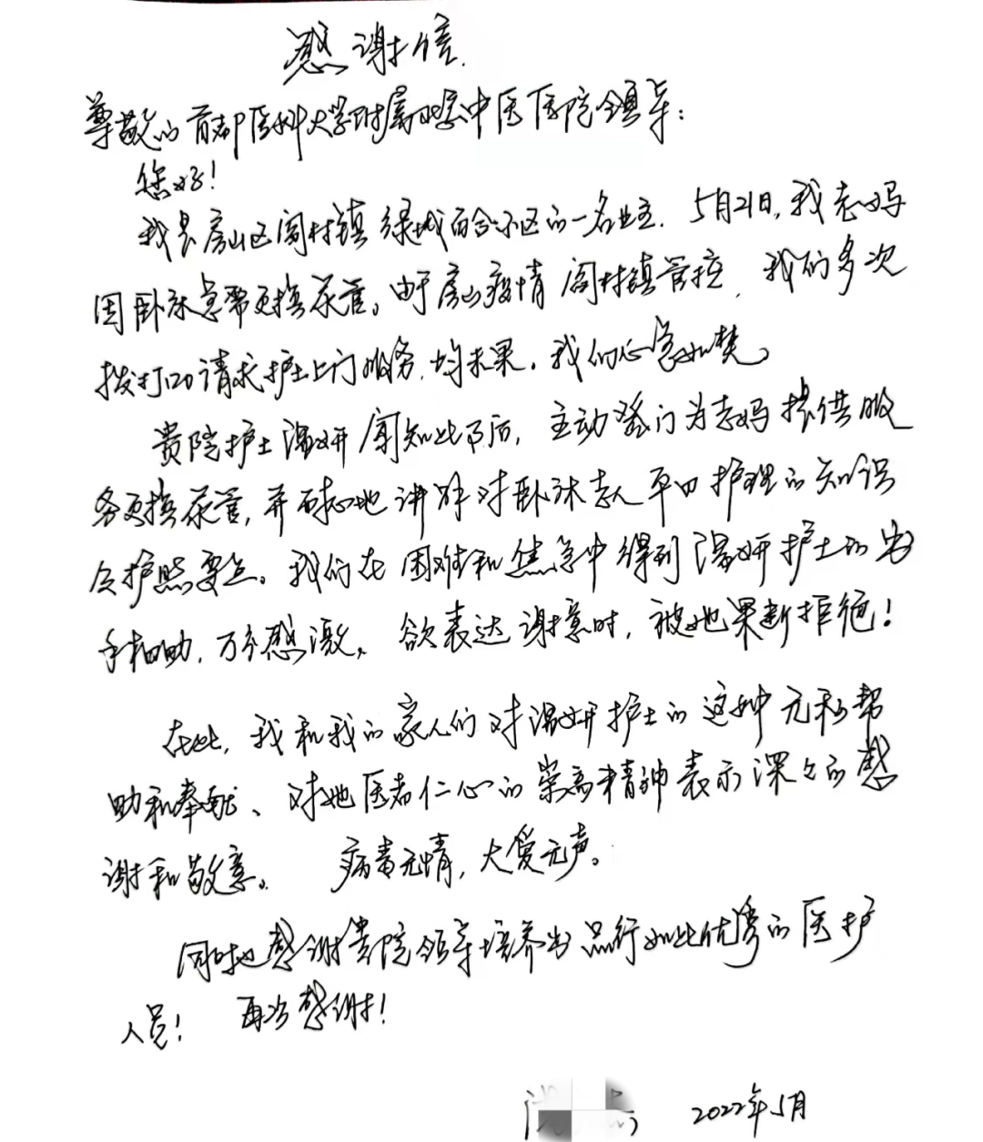 那几天北京正在经历35度的高温,看着满头大汗的温妍,家属想要给温妍一些费用,但是被她拒绝了。为了表达谢意,老人的儿子、女儿向我院写来了感谢信。