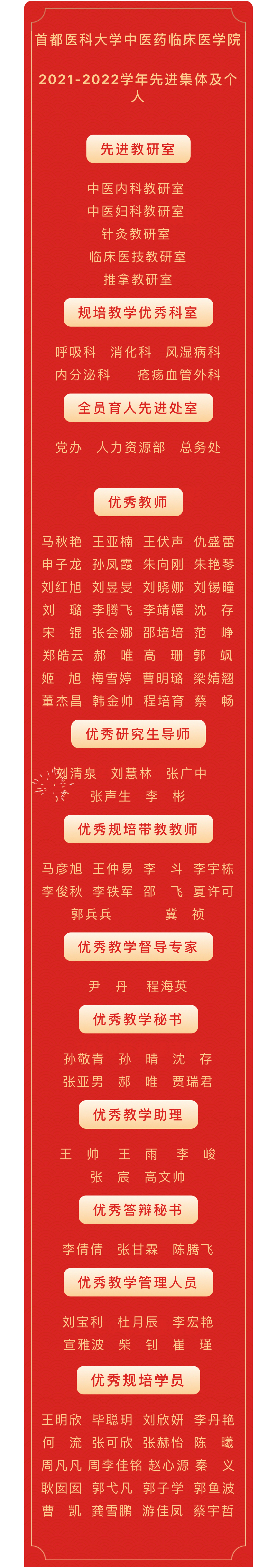 近年来我院教育教学成果丰硕,教学能力水平稳步发展与提升,为中医药事业输送优秀中医人才。在第38个教师节来临之际,全院教职员工站在新的起点,将持续秉承和弘扬“仁、术、勤、和”的院训,以昂扬的斗志,饱满的热情,突出的业绩,同心同德,齐心协力,真抓实干,创建北京中医医院更加美好的明天!