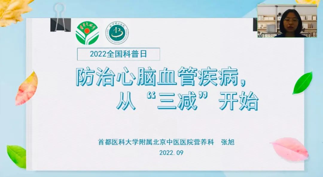 鉴于心脑血管疾病目前已成为危害我国中老年人身体健康和生命安全的主要疾病,其致残率、致死率高,有年轻化的趋势,且带来了沉重的社会及经济负担。本次活动线上讲座以《防治心脑血管疾病 从“三减”开始》为题,为患者介绍心脑血管疾病的“三减”饮食原则——减盐、减油、减糖。在讲解同时也以一日低盐低脂糖尿病饮食食谱为例,将“三减饮食”具象化。“三减”饮食是防治心脑血管疾病的基础治疗及有效措施,改变生活方式,调整饮食结构,健康携手向未来。