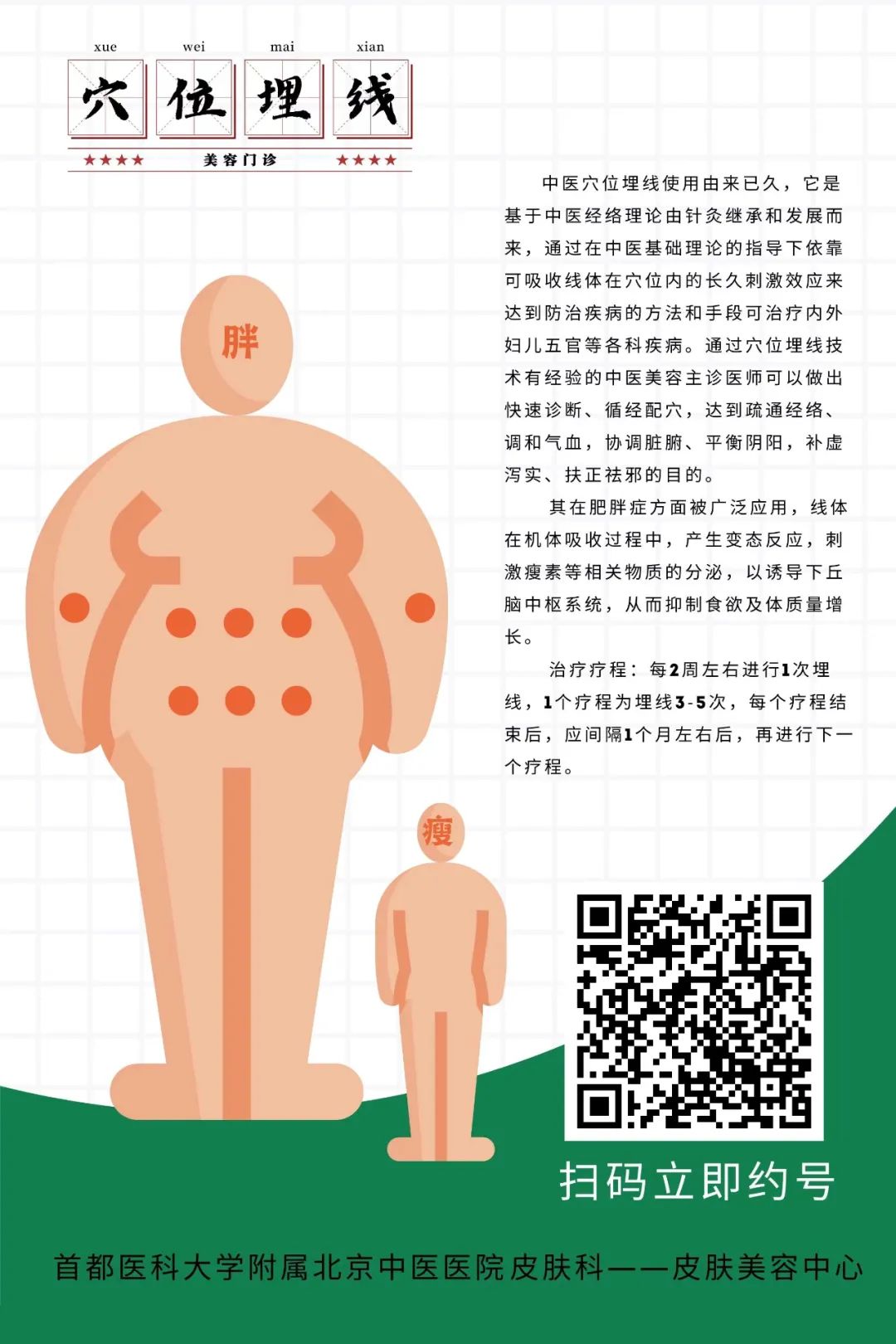中医穴位埋线使用由来已久,它是基于中医经络腧穴理论,由针灸继承和发展而来,依靠线体在穴位内的长久刺激效应来达到防治疾病的方法和手段,可治疗内外妇儿五官等各科疾病。有经验的中医美容主诊医师可以根据求美者的具体情况进行辨证,循经配穴,通过穴位埋线治疗,达到疏通经络、调和气血,协调脏腑、平衡阴阳,补虚泻实、扶正祛邪的目的。我院皮肤科美容门诊开展的穴位埋线减肥治疗,将传统针灸经络理论与现代材料科技相结合,具有健脾和胃、化痰祛湿、疏肝行气、调和气血等功效,对于由于脾胃不和、痰湿凝滞、肝郁气滞、气血失调等原因导致的全身或局部(腰、腹、臂、腿)肥胖有一定治疗作用。