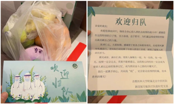 “欢迎你满血归队,继续投身到抗击疫情的战斗中......我们一起携手,共同战疫,定会驱走疫情的阴霾,迎来胜利的曙光!”看着欢迎归队的卡片,回想这几天特殊的经历,北京中医医院护士韩伟萌的眼睛湿润了,更加坚定了继续投身到方舱工作的决心。