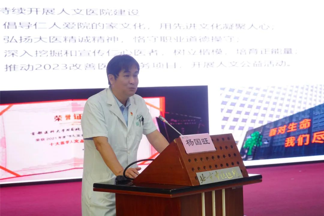 党委委员、副院长杨国旺代表纠正行业不正之风工作领导小组做行风工作报告。针对2022年以来主要行风建设专项工作开展情况及2023年上半年行风建设主要工作进行通报,并部署下半年医院行风建设重点工作。要进一步加强行业自律,完善行风建设工作长效协调机制,持续开展红包专项治理工作及人文医院建设,锻造队伍、凝练精神,做到思想上过硬、行动上端正,明底线、知红线,为真正提高为人民服务的本领而做出努力。