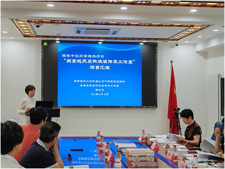 燕京赵氏皮科流派传承工作室是国家中医药管理局获第二轮建设支持的全国51家中医学术流派传承工作室之一。在三年建设期间,工作室取得了丰硕的建设成果。工作室负责人曲剑华从工作室的基本情况、人才培养、内涵建设、推广应用、经费管理等方面详细汇报了传承工作室建设情况。