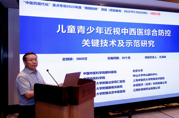 中国中医科学院眼科医院副院长、全国中医药近视防治中心主任、国家重点研发计划“揭榜挂帅”项目负责人亢泽峰教授介绍项目背景和基本情况。表示“中医药现代化”重点专项聚焦高质量发展急需、应用导向鲜明、最终用户明确的重大攻关需求,形成2022年度“揭榜挂帅”任务。榜单围绕“面向人民健康需求”重大应用场景,针对儿童青少年近视高发,研究近视中西医综合防控的适宜关键技术和示范应用。
