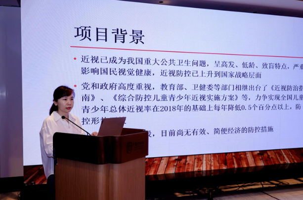 上海中医药大学附属龙华医院江丹副主任医师代表刘新泉教授团队介绍“中医特色近视防控系列设备多中心临床研究”。针对儿童青少年近视受环境等多因素影响,缺乏有效防控技术、措施等难点,研究突破局部干预及治疗瓶颈,提升近视治疗效果,开发针对性产品,赋能中医外治法。