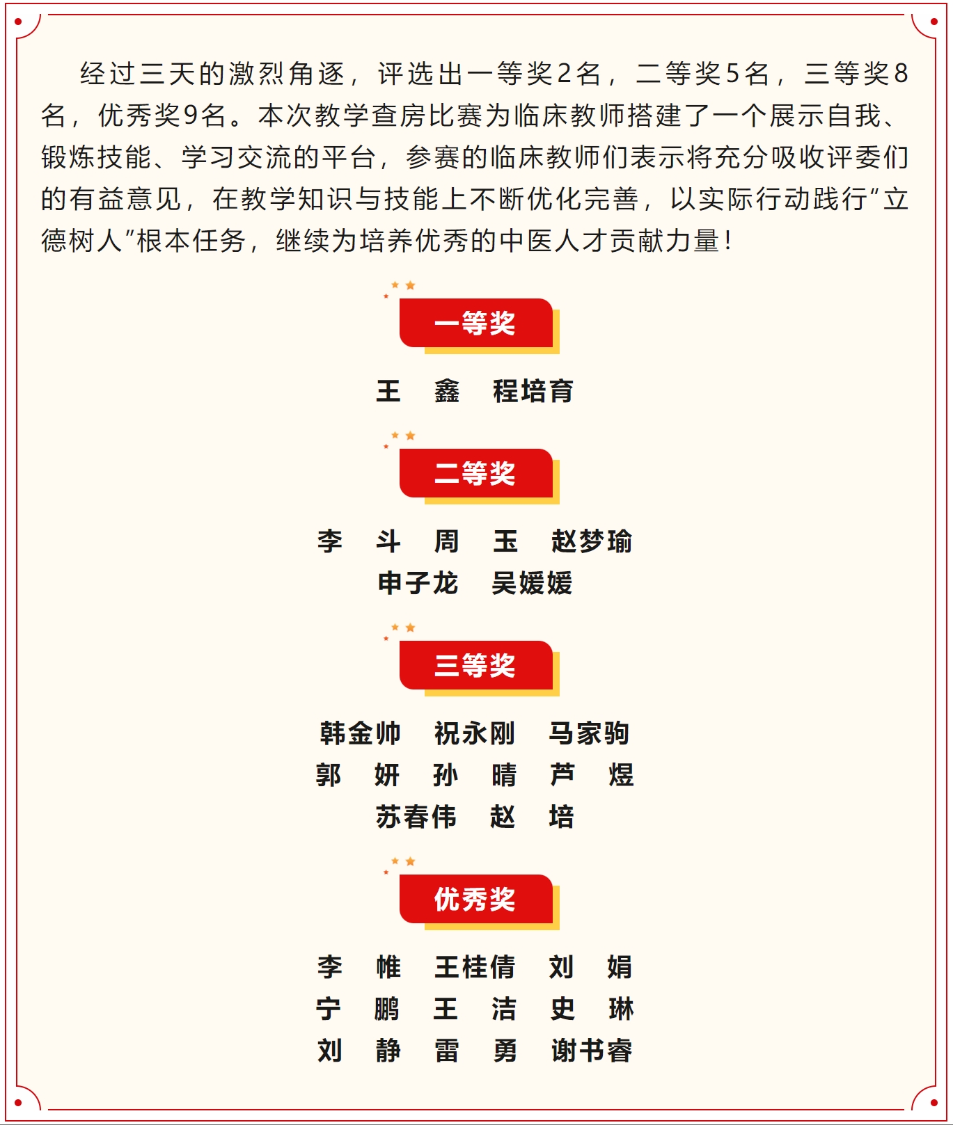 11月27日至11月30日,第六届教学查房比赛如期举行,参赛教师们充分体现了自身的教学能力水平,运用启发式、互动式教学,抽丝剥茧、层层递进强化对学生们临床思维能力的培养,展现了良好的精神风貌。