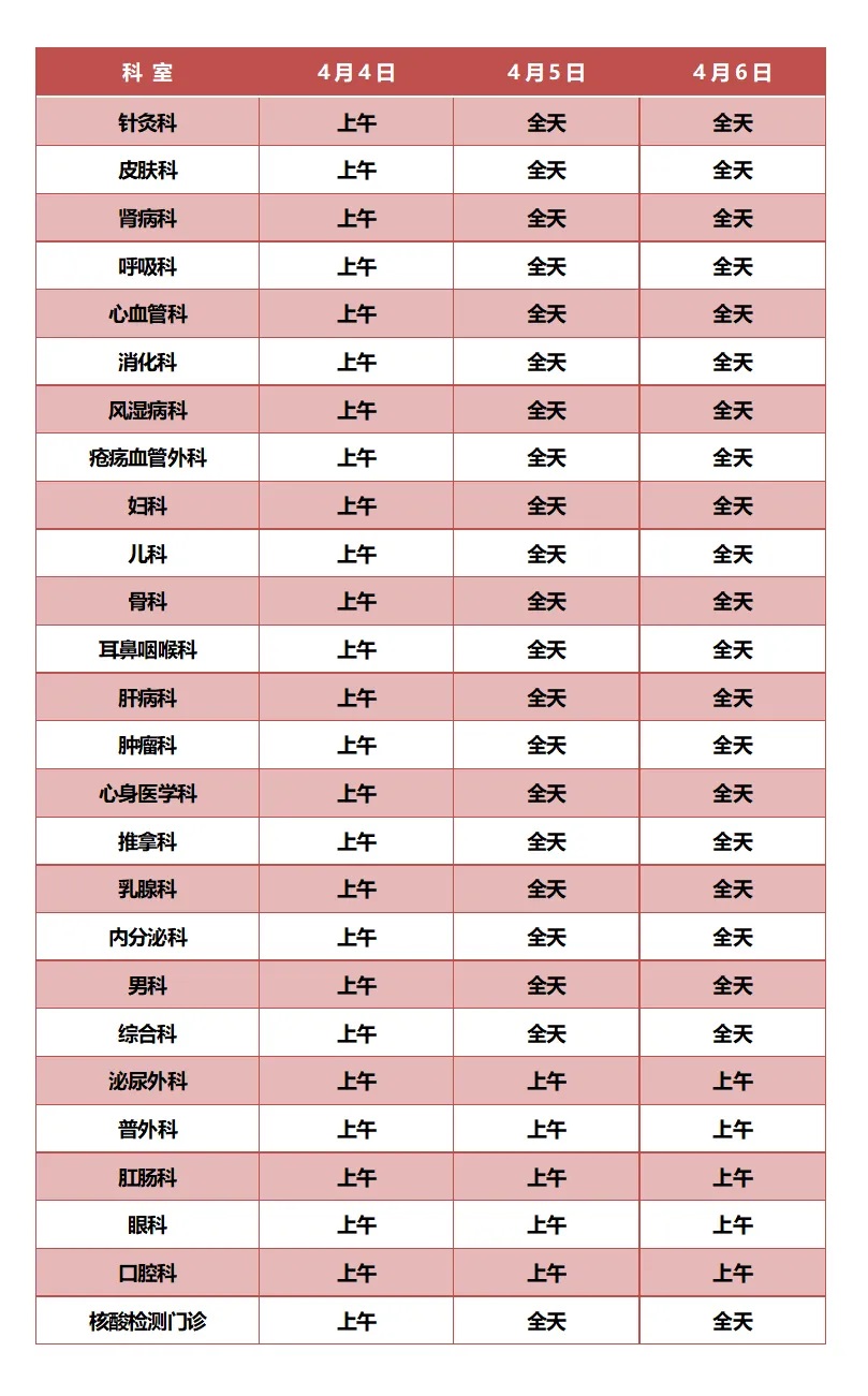 4月7日(星期日调休):按星期五出诊,全天门诊。(取号截止时间为上午11:30,下午16:00)