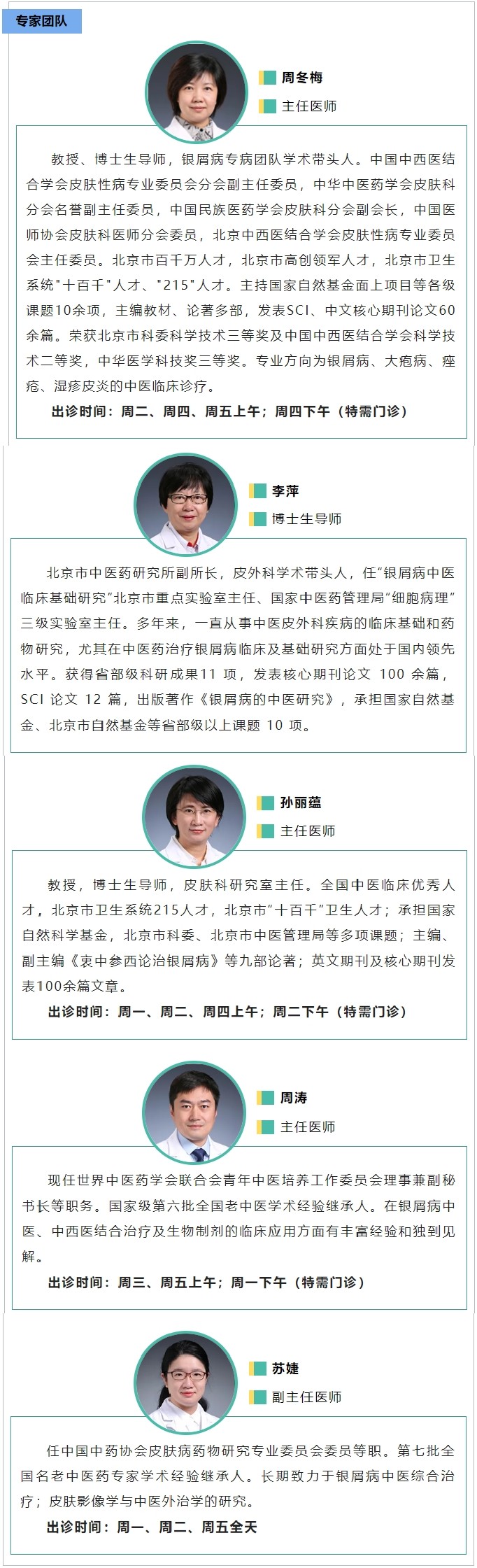 诊治范围银屑病,主要表现为局部或全身分布的鳞屑性红斑或斑块,是一种遗传与环境共同作用诱发的免疫介导的慢性、复发性、炎症性、系统性疾病。分型包括寻常型银屑病,脓疱型银屑病,红皮病型银屑病,银屑病关节炎,特殊部位及反向银屑病。银屑病可合并心血管疾病、糖尿病、高血压、代谢综合征等多种疾病,严重影响患者的生活质量。银屑病也是一种全球性疾病,故而2004年国际银屑病协会联合会将每年的10月29日定为“世界银屑病日”(World Psoriasis Day,简称WPD)。