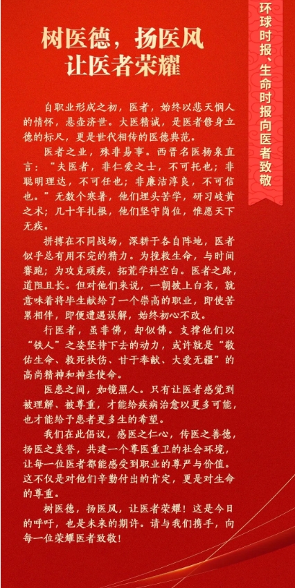 “敬佑生命·荣耀医者”公益活动致力于树立医者典范、弘扬医者精神、促进医患和谐,为营造尊医重卫的社会氛围提供了良好环境。长期以来,广大医务工作者用专业和大爱驱散痛苦,为挽救人民群众生命健康、维护生命尊严顽强拼搏,给大众带来希望和生机,用实际行动诠释了“敬佑生命、救死扶伤、甘于奉献、大爱无疆”的崇高精神。